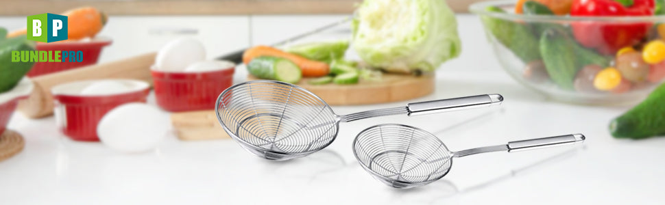 - Wide Range of Uses. Our multipurpose Strainers comes with a concave basket great for separating and lifting food or draining and collecting noodles and pasta. Also perfect for blanching vegetables and meat, frying dumplings, French fries or serving hot pot dishes. Our Strainers ladle is the perfect utensil for everyday cooking.