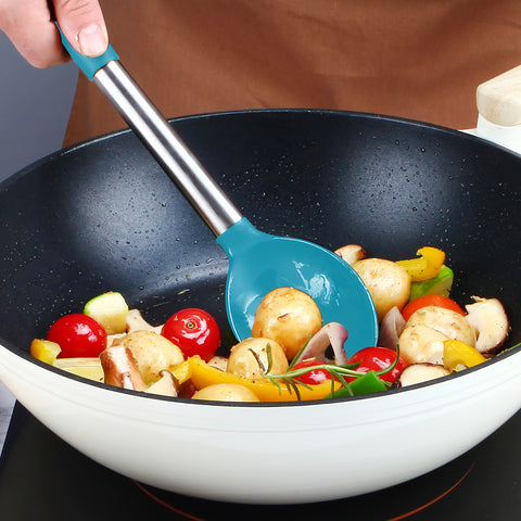 - THE MOST THOUGHTFUL DESIGN : The high-quality 18/8 stainless steel is more durable and keeps you away from the trouble of kitchen utensils rusting or breaking. The anti-scald silicone handle is not easy to conduct heat and is more comfortable to hold than traditional utensils. While you enjoy a happy cooking time, you can better protect your hands from being scalded.