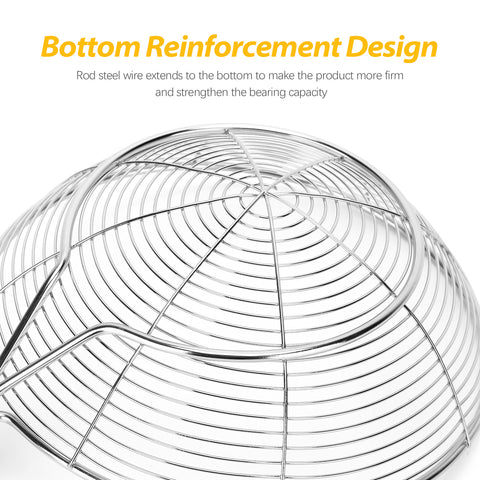 - Practical and Reliable Kitchen Helper. Cook your favorite foods faster with this premium quality strainer. Our food Strainers is designed with a wide basket for scooping and lifting food while draining away hot oil or boiling liquids. Food sits on the wire strainer to prevent splashes and mess. Keeps your food flavorful and crispy.